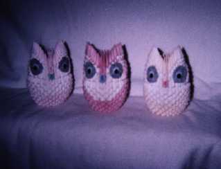 母の作ったリハビリ折りのふくろうたちを、妹が使い捨てカメラでカシャ! 薄暗闇で何やら相談している様子に見えるかしら? ホームに戻る